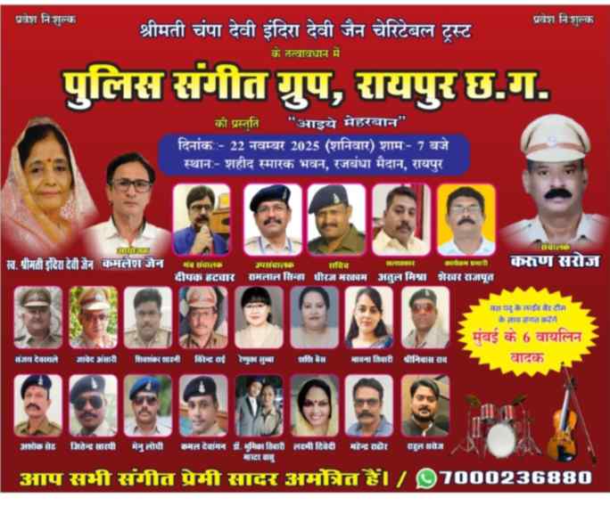 रायपुर, (The Grand Leakage News). छत्तीसगढ़ प्रदेश की राजधानी रायपुर में पुलिस संगीत समूह द्वारा श्रीमती चंपा देवी इंदिरा देवी जैन चैरिटेबल ट्रस्ट के तत्वावधान में एक भव्य संगीत समारोह का आयोजन दिनांक 22 नवंबर 2025 को किया जा रहा है। यह कार्यक्रम शहीद स्मारक भवन, रजबंधा मैदान, रायपुर में शाम 6:30 बजे से प्रारंभ होगा।