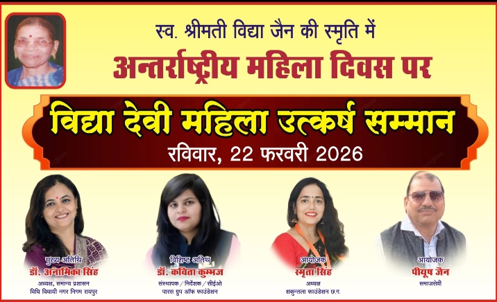 रायपुर, (TGL NEWS). प्रदेश की राजधानी रायपुर में विगत दिनों अंतर्राष्ट्रीय महिला दिवस के शुभ अवसर पर वरिष्ठ समाजसेवी स्वर्गीय श्रीमती विद्या देवी जैन की पुण्य स्मृति में उनके पुत्र श्री पीयूष जैन द्वारा समाज के विभिन्न क्षेत्रों में उल्लेखनीय योगदान देने वाली महिलाओं को “विद्या देवी महिला उत्कर्ष सम्मान 2026” से सम्मानित किया गया।